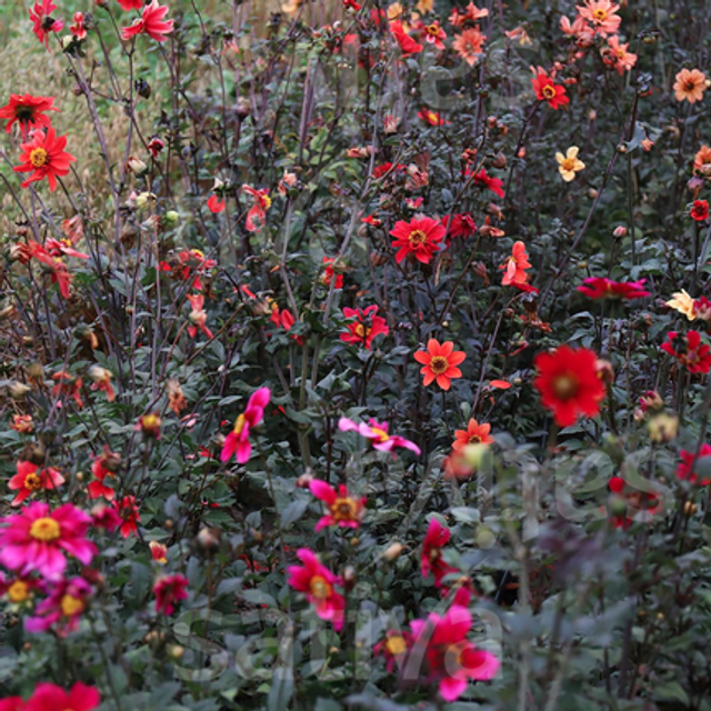 Fleurs du jaune à l'orange, au rouge, rose et fuchsia. Beau feuillage rouge foncé qui souligne les couleurs des fleurs. Floraison tardive, jusqu'aux premières gelées. Déterrer les tubercules pour l'hivernage car les dahlias ne supportent pas le gel.